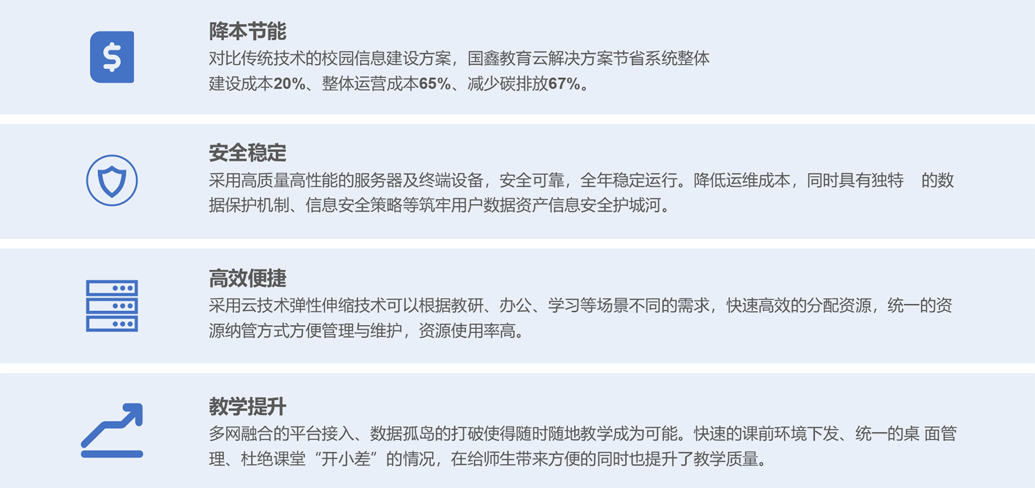 尊龙凯时人生就是搏教育云解决方案是针对教育业现状及遵循政策指导方向,采用自研国产硬件及自研软件平台,推出的教育行业云平台方案。方案基于云计算技术、互联网+战略格局、契合融合创新的思路,助力校园智慧建设,更好地为教育改革和开展给予信息化基础环境支撑。