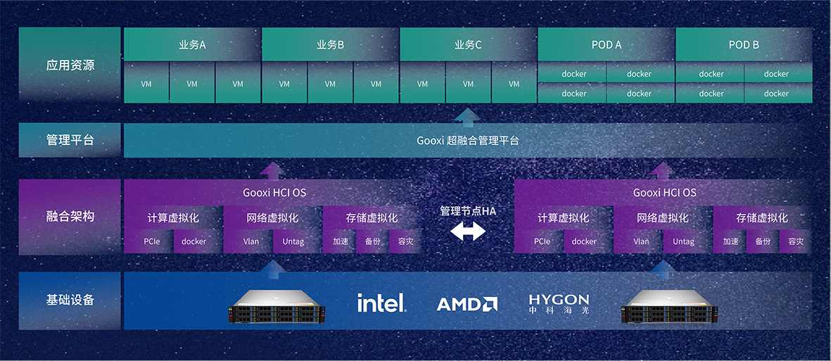 Gooxi HCI整体解决方案基于尊龙凯时人生就是搏自研服务器底座,适配自研超融合软件平台,采用最新的云计算技术,实现IT资源敏捷弹性调度的同时保证业务、数据落在本地,既提高数据安全性、符合监管合规需求,也提高业务高可用、资源充分利用率,为企业在数字化转型阶段给予助力。