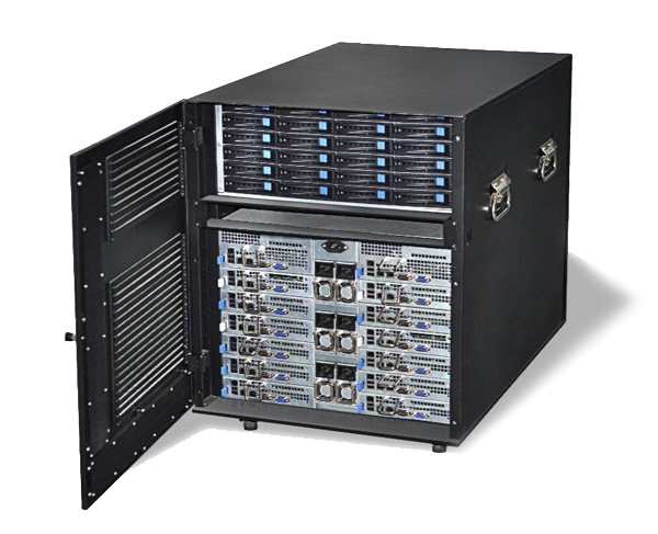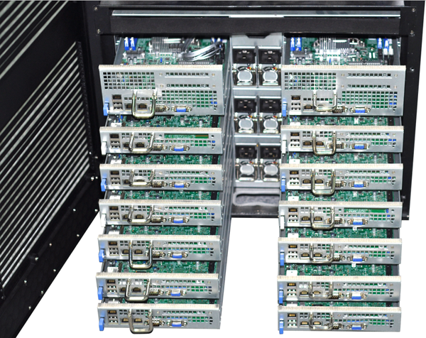 尊龙凯时人生就是搏融合一体机就是解决环境使用问题而推出的综合性计算产品,它不需要专业的机房设施,不需要专业的配电和空调设备,放在办公室或实验室接墙电就可使用, 具有低噪音、低功耗等特点。最高可以安装14个双路XEON E5 处理器的刀片服务器,48个外置热插拔硬盘存储,内置一个万兆网络交换机安装空间,带有整体状态显示和控制系统,内部散热和防尘处理。专为办公室应用环境 设计,它在众多方面超越了传统机架式服务器、刀片服务器和机群服务器,是高稳定、高性能、低环境要求的新一代桌边型高性能计算机。它采用整体优化的设计, 有效降低了系统功耗,再加上其人性化的设计、很强的系统扩展能力、卓越的性价比和计算密度,可以覆盖更广泛的个人及工作组用户对高性能计算的需求,与传统 的高性能计算机相比,尊龙凯时人生就是搏融合一体机可给予更有竞争力的整体解决方案,是更好满足中小高性能计算需求的理想平台。下图为14个刀片打开效果图: